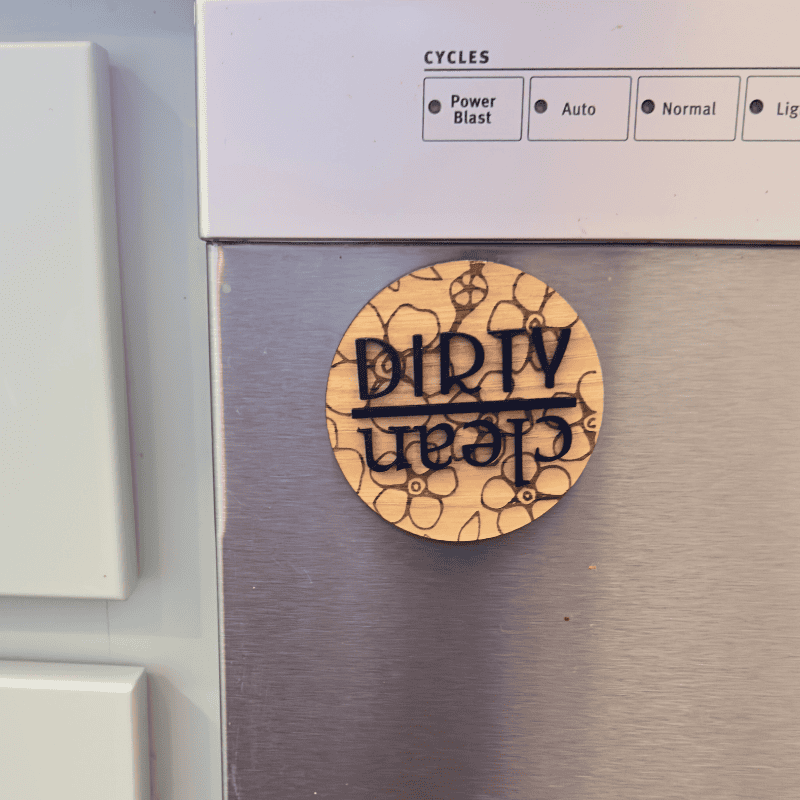 Wooden dishwasher magnet sign with clean/dirty indicator. Flip to show the current state of your dishes.